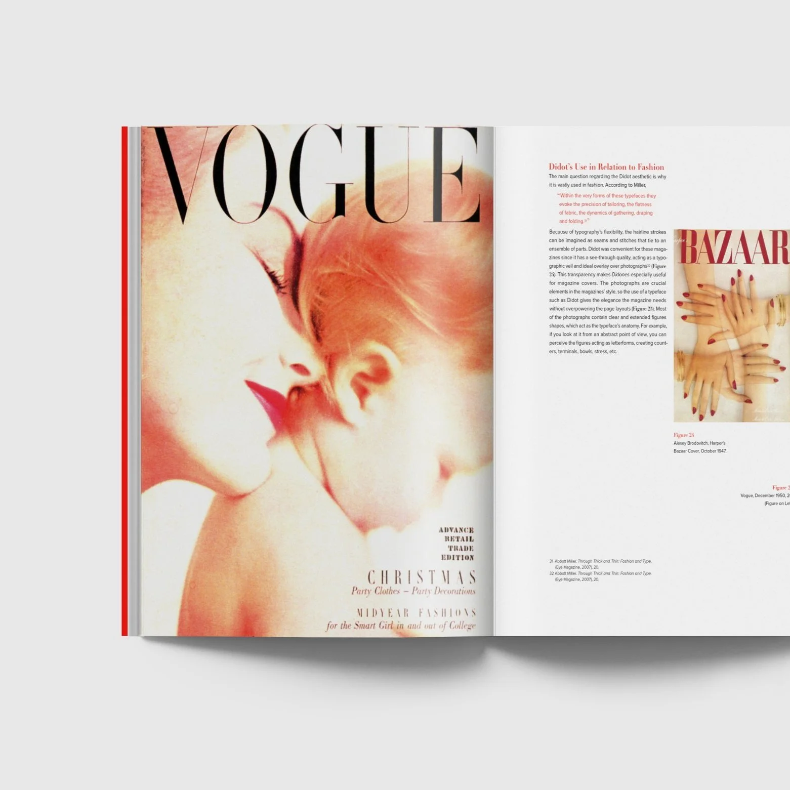 This 32-page printed monograph thoroughly studies Didot, which is an eighteenth century Modern typeface that has influenced culture throughout history. The typeface is most commonly known for its use in contemporary society, especially in Vogue and Harper's Bazaar.
