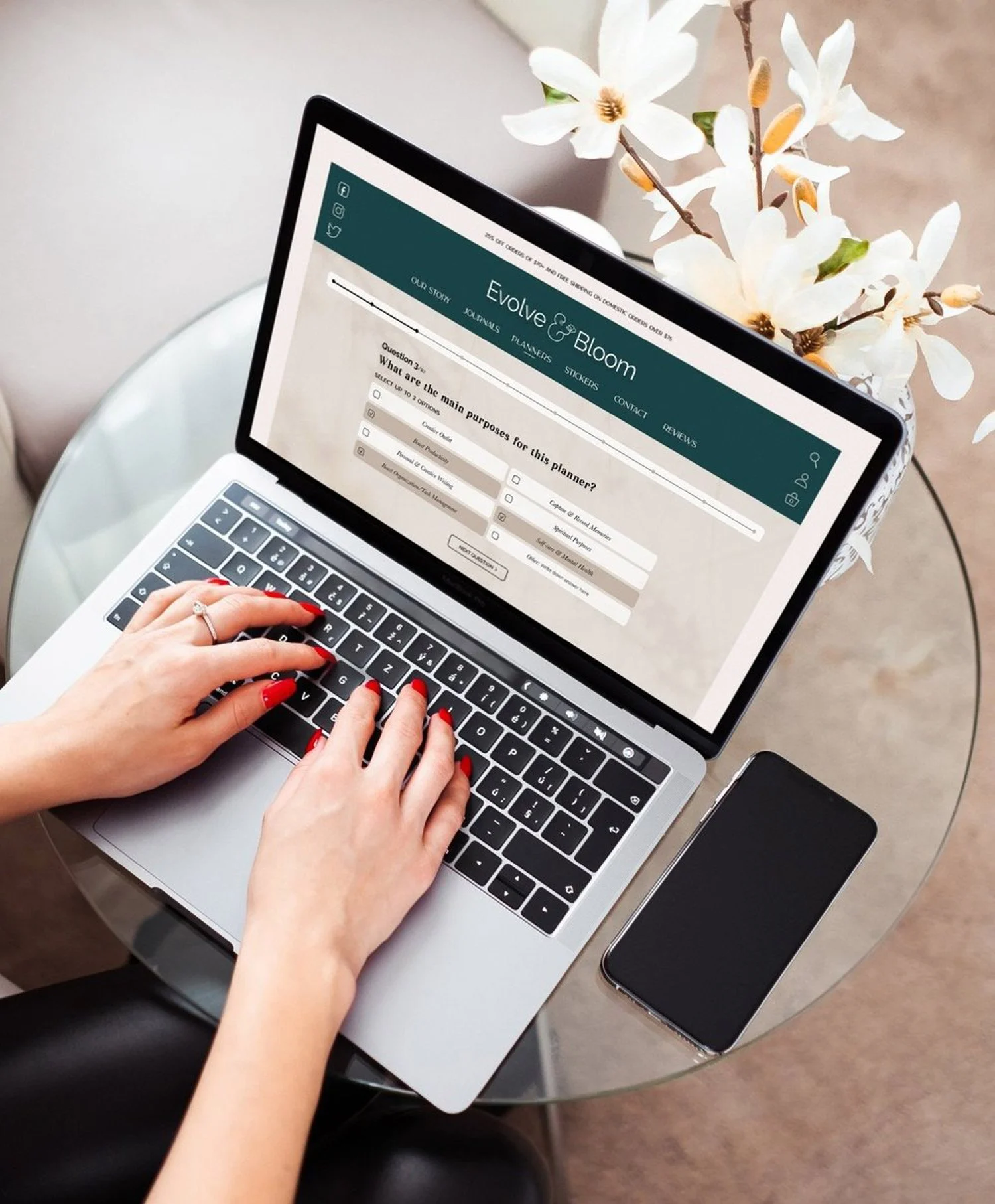 Woman on her macbook using the Evolve & Bloom planner website design on a marble table with coffee.