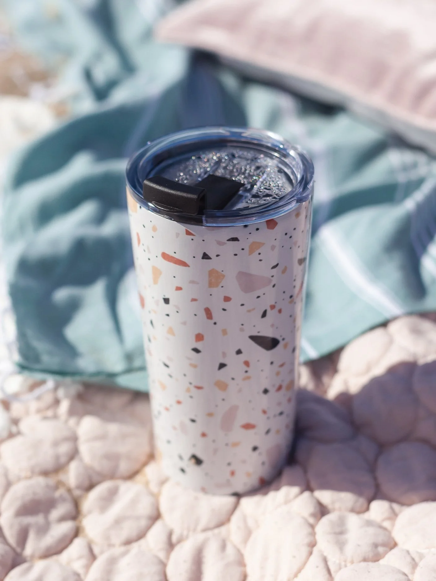 This custom pattern is designed with the purpose of replicating the elegant terrazzo style using a variety of subtle shapes and textures. The pattern’s color palette is neutral and minimalistic with slight color variations, making it easily match any other design or product. Some of the products it works great with include phone cases, travel mugs, and coasters.